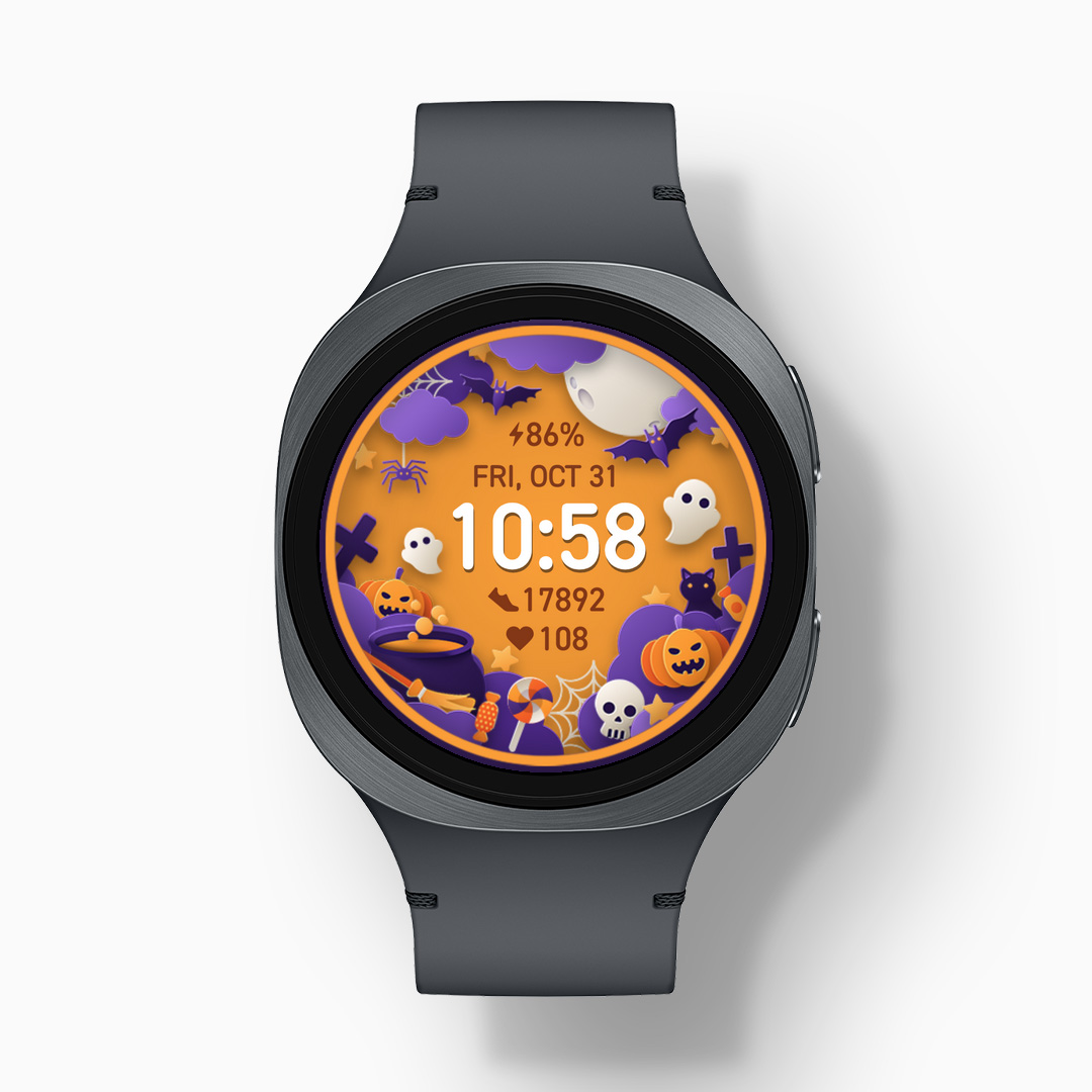 Featuring iconic Halloween elements—pumpkins, ghosts, bats, candy, and more—each design shifts subtly as you move, creating a sense of depth and magic. Available in 3+1 color variations, it blends festive charm with functional data like time, date, heart rate, and step count. Designed for Wear OS, it’s the perfect companion for spooky season.