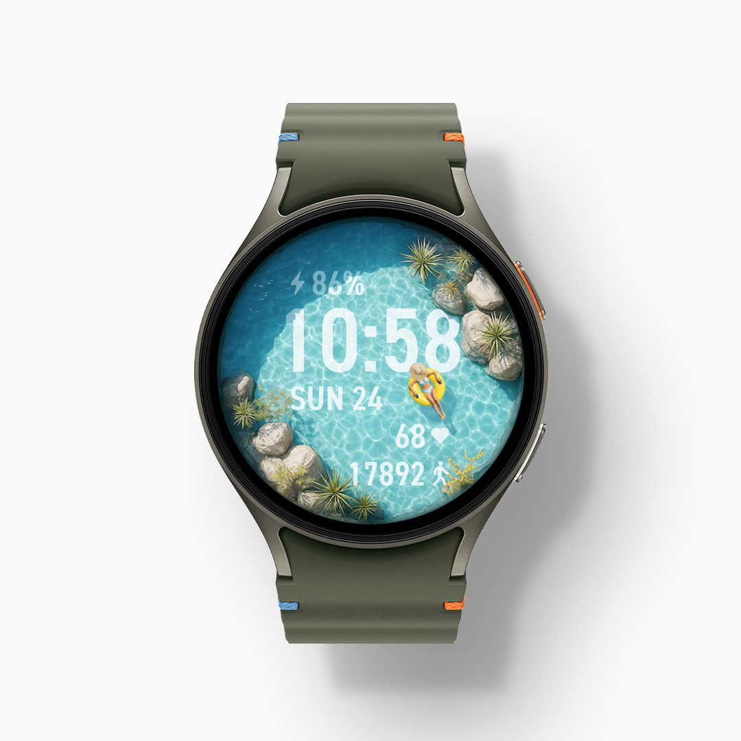 Escape the daily grind and dive into a miniature resort right on your wrist. POCKET RESORT is an immersive 3D pool watch face that uses your watch’s gyro sensor to create a stunning, lifelike experience. Watch as the waves and shadows shift with every tilt of your wrist, making it feel like a tiny paradise is floating right on your arm.